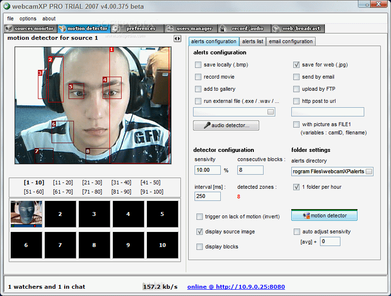 WebcamXP merupakan software webcam surveilans yang bagus serta gratis. Software ini memungkinkan Anda untuk menghubungkan hingga 6 kamera, dan melihat video webcam dari internet. Juga mampu menunjukkan sebuah alamat IP, lokasi, dan informasi negara. Yang terbaru WebcamXP memungkinkan Anda streaming webcam Anda ke iPhone.